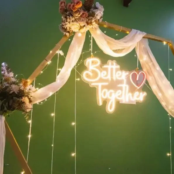 At the center is a 6-feet hexagon backdrop, gracefully draped with soft white fabric to give a clean and sophisticated look. It is beautifully enhanced with artificial floral arrangements, adding depth and charm to the overall décor. The glowing “Better Together” neon sign becomes the highlight, symbolizing love and togetherness while creating a perfect photo backdrop.