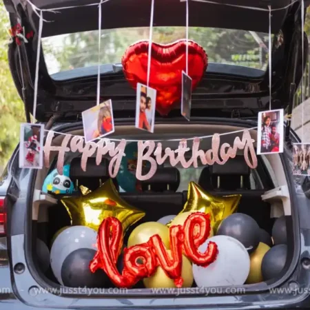1 heart-shaped foil balloon, 1 “Happy Birthday” paper banner, 1 cursive love letter foil balloon, 2 star-shaped foil balloons, 12 hanging photos (your personal memories), 20-25 decorative balloons (assorted colors).