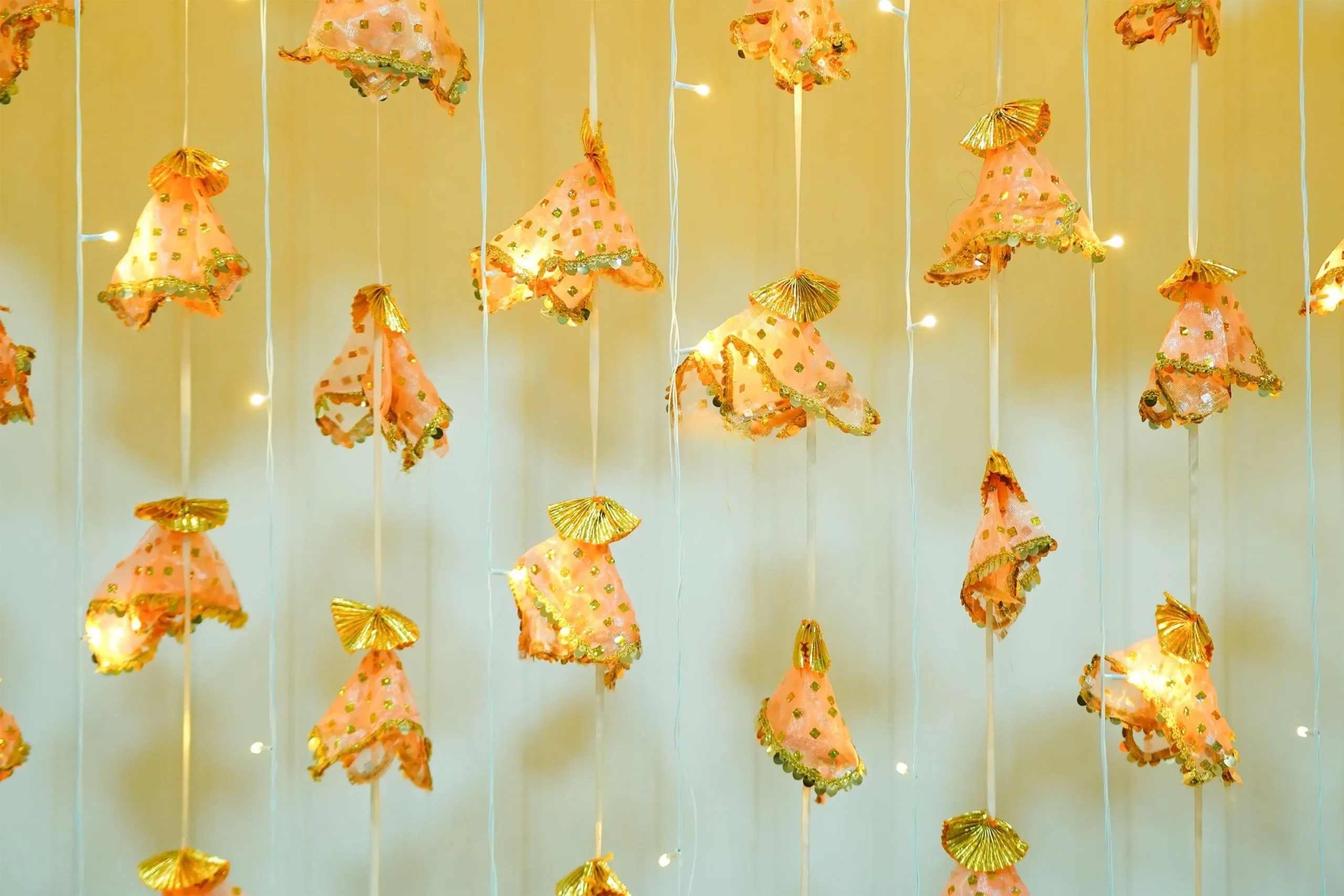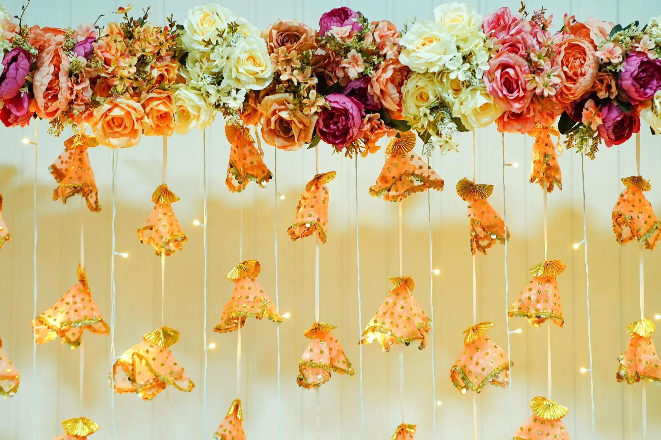 Looking to create a beautiful and eye-catching setting for your Haldi and Mehndi celebrations? This floral and tassel decor setup is designed to add charm, colour, and a festive feel to your special day. It creates a perfect backdrop that enhances the overall vibe of the ceremony while offering a stylish space for memorable moments.