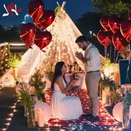 Indulge in a romantic Fountain Dining experience at Sarai Kale Khan , complete with a private cabana canopy setup featuring cozy pillows and mattresses. Enjoy a 3-course gourmet meal surrounded by rose petals , candlelight , and fairy lights . A personalized chalkboard message and elegant props make this an unforgettable celebration of love.