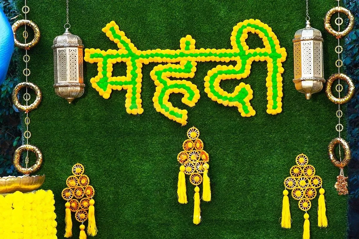 This decor features a lush green backdrop with a central Mehndi board, paired with a comfortable low-seating arrangement. Traditional elements like a golden chowki and brass lamps add warmth and cultural richness, while decorative accents such as golden rings, diamond hangings, and mirror balls enhance the overall look.