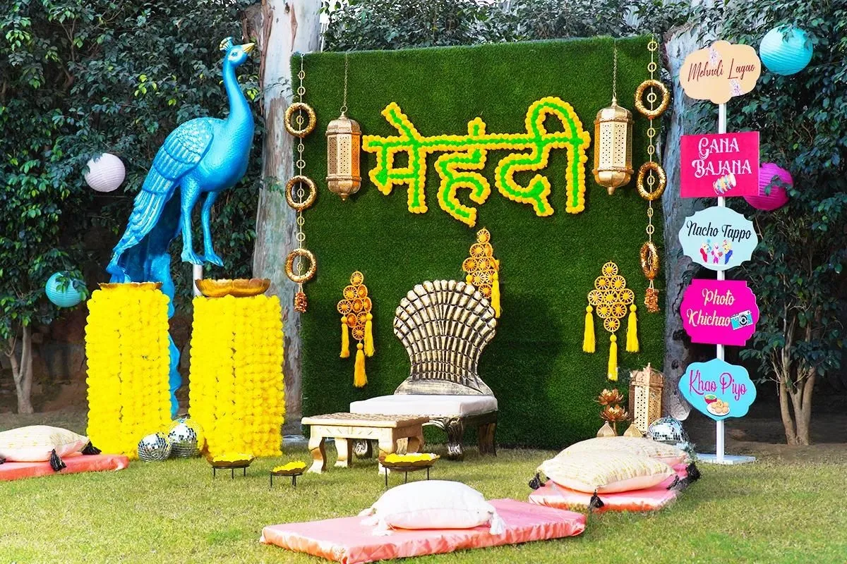 Mehndi decor is a key element in creating a vibrant and memorable celebration. Among the many styles, a peacock-themed setup stands out for its rich colours, intricate detailing, and graceful appeal. It brings a unique charm to the event, making the atmosphere feel lively, elegant, and visually striking.