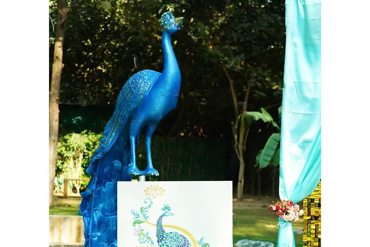 This decor setup features a striking sequin backdrop paired with flowing blue drapes, creating a bold and luxurious visual. Decorative panels inspired by Persian design add character, while peacock accents bring a graceful touch to the overall look.