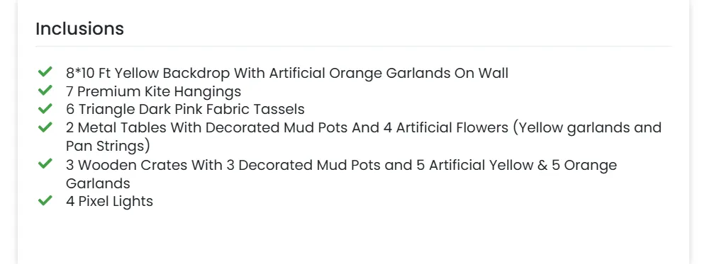 Playful kite hangings add movement and charm, while contrasting pink tassels bring depth and a pop of colour to the overall look. Decorative tables are styled with mud pots, floral accents, and garlands, creating a balanced blend of tradition and creativity. Wooden crates with similar detailing further enhance the setup, adding layers and visual interest.