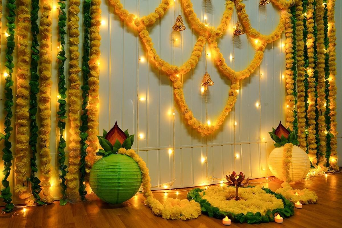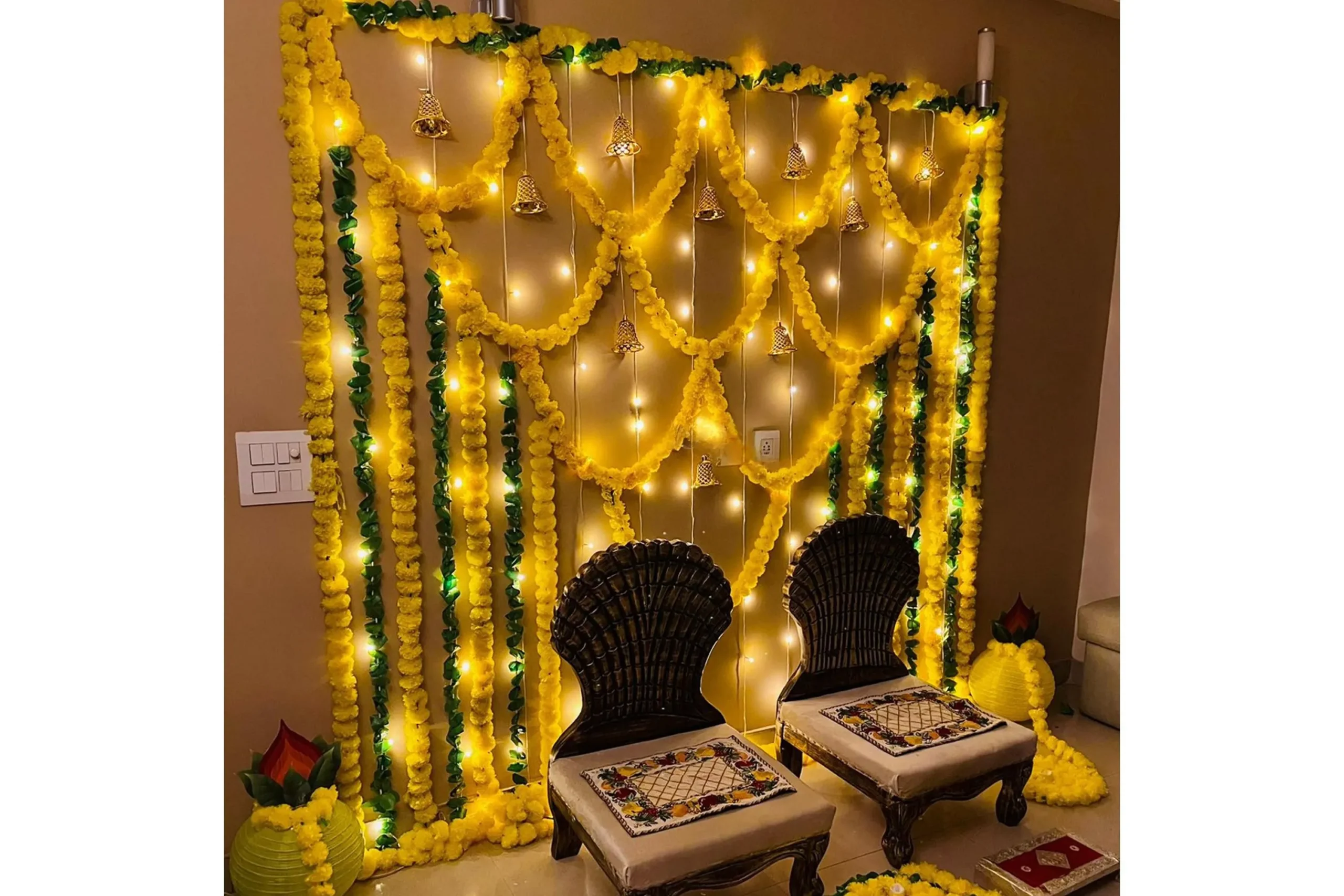 This decor blends traditional warmth with a modern touch. The combination of yellow and green garlands adds brightness and positivity to the setup, creating a soothing yet festive environment where couples can enjoy their special moments and blessings from loved ones.
